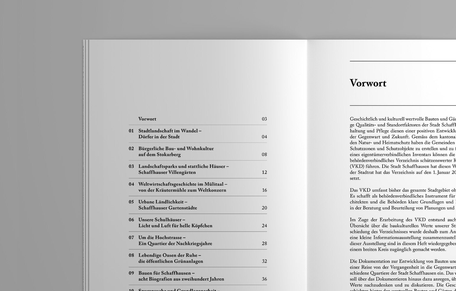 Die Denkmalpflege Schaffhausen hat ein Verzeichnis schützenswerter Kulturdenkmäler (VKD) erarbeitet, zu dessen Fertigstellung eine kleine Informationsausstellung organisiert und eine Broschüre herausgegeben wurde. Die Geschichte hinter den wertvollen Bauten und Gärten der Stadt Schaffhausen werden ins öffentliche Bewusstsein gerückt und tragen damit zu einer lebendigen Baukultur bei.